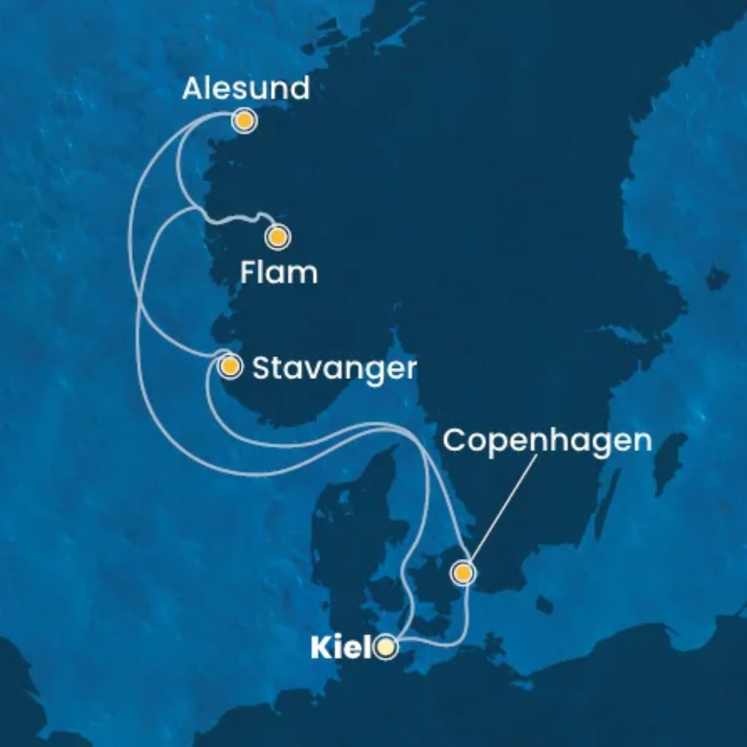 Disbrigo delle formalità doganali, partenza volo per Kiel. All’arrivo trasferimento in pullman collettivo dall’aeroporto al porto; imbarco e sistemazione nella cabina assegnata.